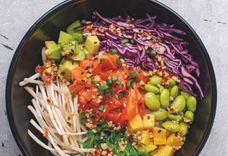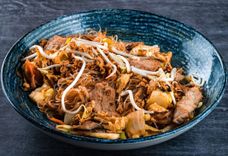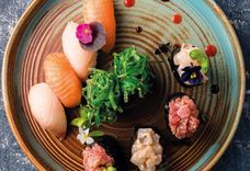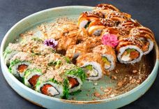 165 г • тунец, лосось, копчёный угорь, морской окунь, креветка, соус терияки, дайкон, соус сашими, лайм,перец чили, кунжут, соус шрирача