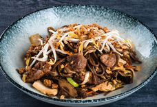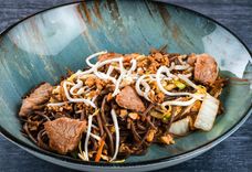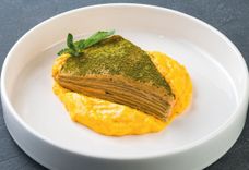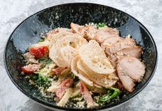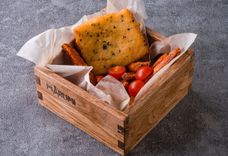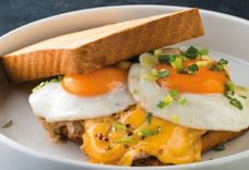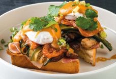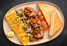 400 г • крабовый омлет, жареные грибы, свиная грудинка чар си, бобы в томатном соусе, томаты черри, лайм, пикантный соус, зеленый лук, кунжут, подается с хлебом Бриошь