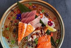 165 г • тунец, лосось, копчёный угорь, морской окунь, креветка, соус терияки, дайкон, соус сашими, лайм,перец чили, кунжут, соус шрирача