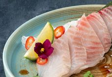 104 г • морской окунь, дайкон, соус сашими, лайм, перец чили, кунжут, соус шрирача